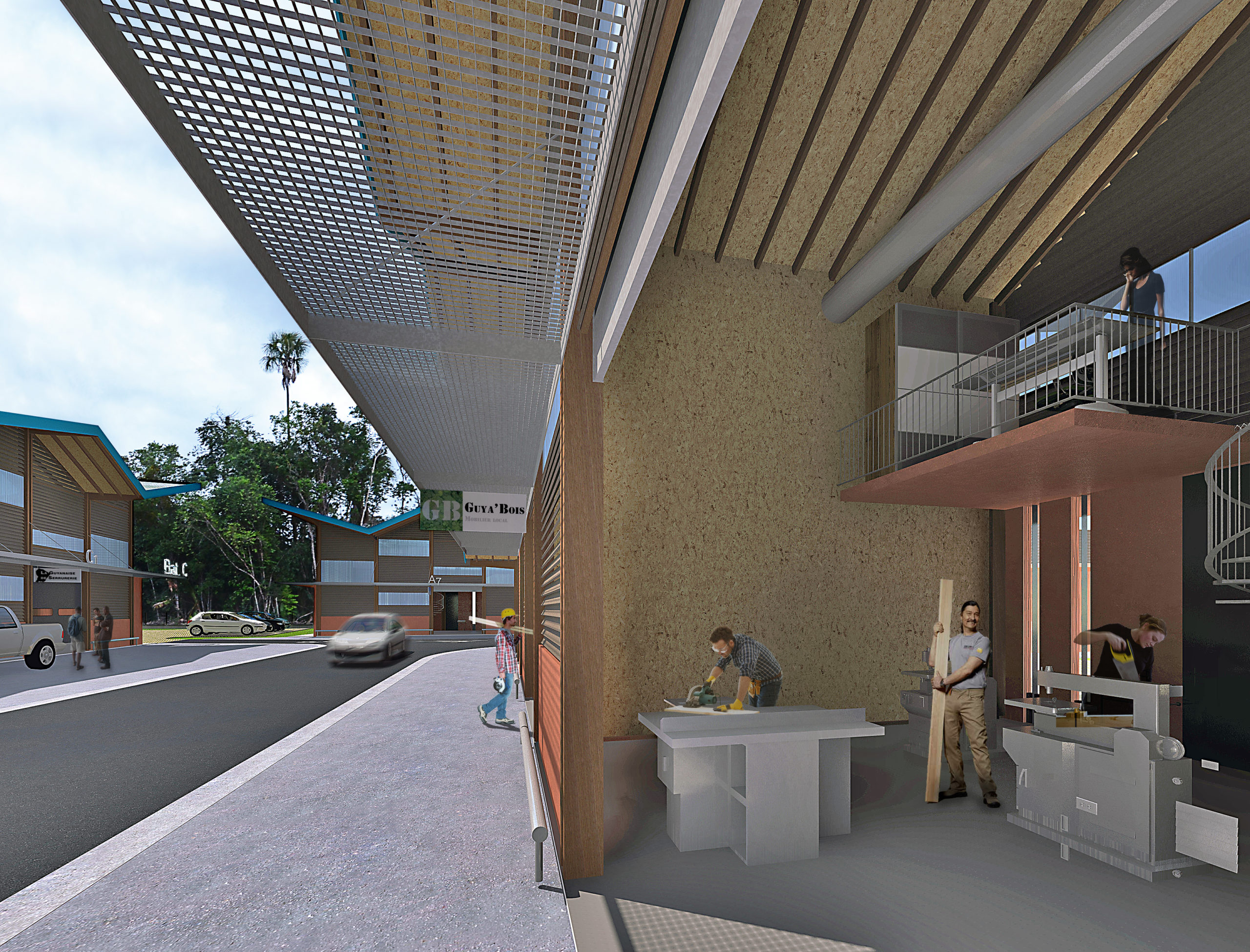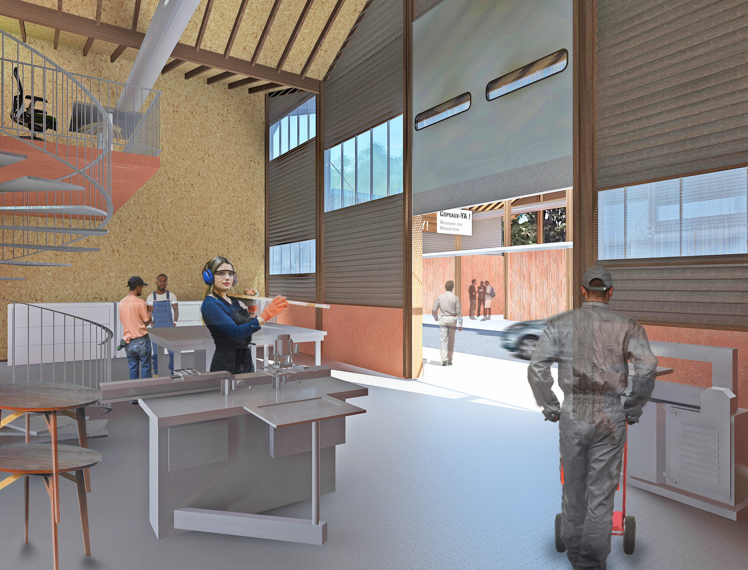 • un pôle technique extérieur, léger et couvert : mise à disposition de machines spécifiques au travail du bois et de la construction dans un hall commun (espace de stockage, séchoir, tunnel de traitement, cabine à vernir…)